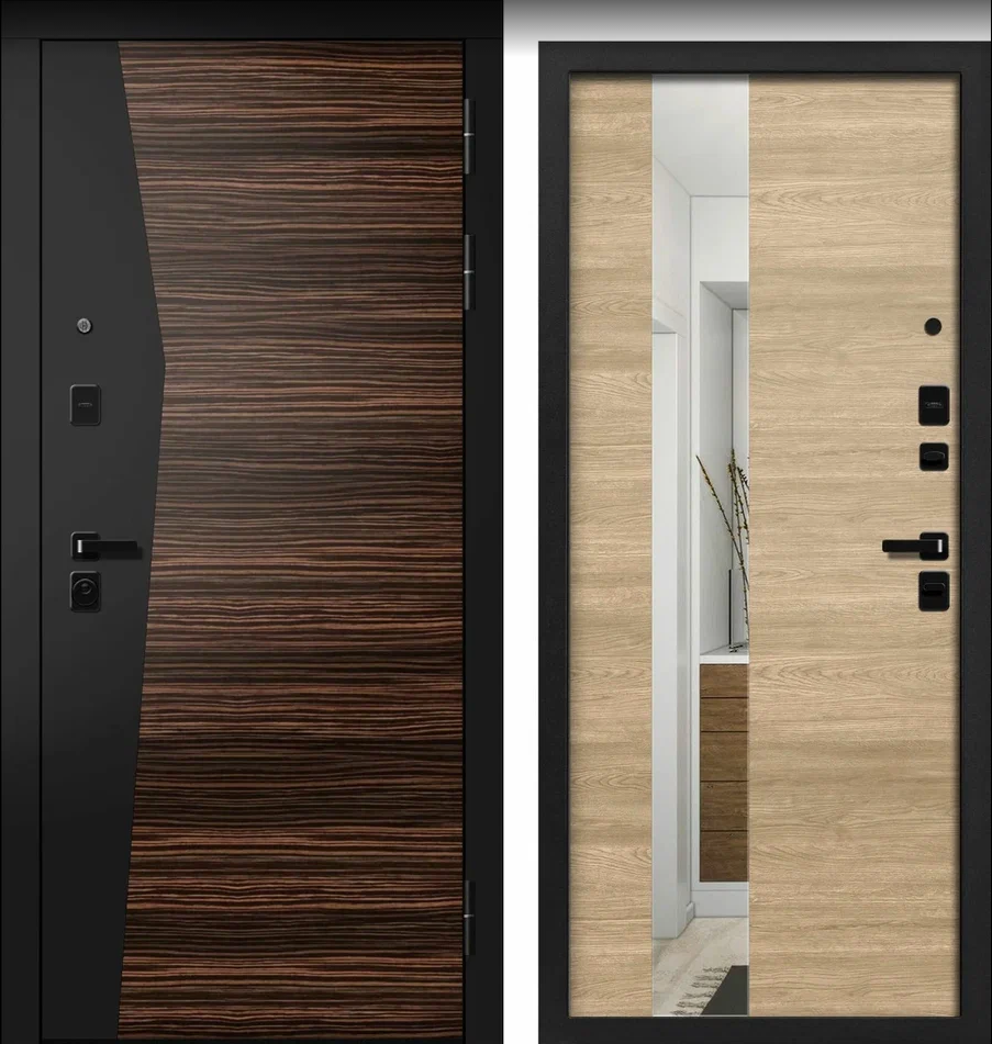 Трехслойное полимерное покрытие. Цвет: МУАР ЧЕРНЫЙ. МДФ щит 10 мм. Монолит найт+Зебрано горизонтальный МДФ наличники. |