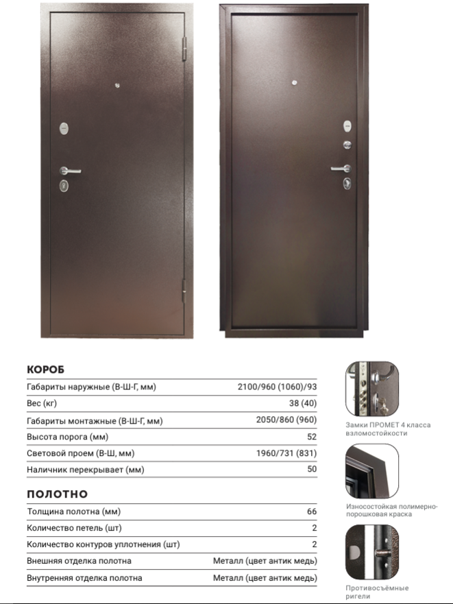 Внимание. Данная дверь производится заводом Промет и продаётся под двумя наименованиями Титан (Промет Торговая Марка) и Ника-1 (Ретвизан Торговая Марка). Если на упаковке двери указано Ника, значит данная дверь изготовлена по заказу Ретвизана на заводе Промета, и продаётся под наименованием Ника. Если Титан значит это дверь также изготовлена на заводе Промет НО продаётся под названием Титан. У дверей с наименованием Ника-1 в упаковке лежат паспорта от дверей Титан, что не является нарушением поскольку все технические данные указаны верно, а наименование изделия чисто маркетинговый вопрос.